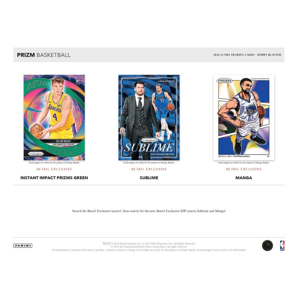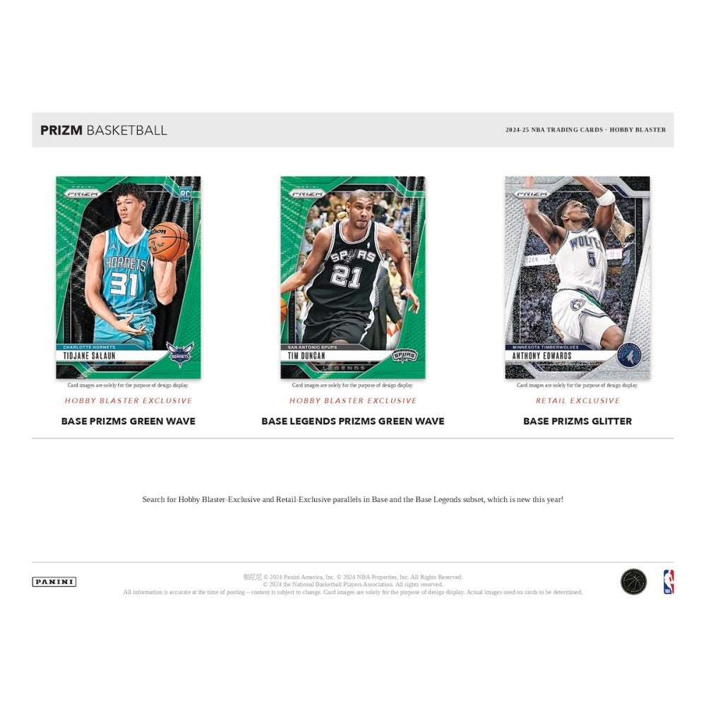 2024-25 Panini Prizm Basketball Hobby Exclusive Blaster Box, featuring 6 packs per box, each containing 4 cards. On average, each box includes 3 exclusive Green Wave Prizms. Collectors can anticipate finding Autos and ultra-rare 'Sublime' and 'Manga' inserts.