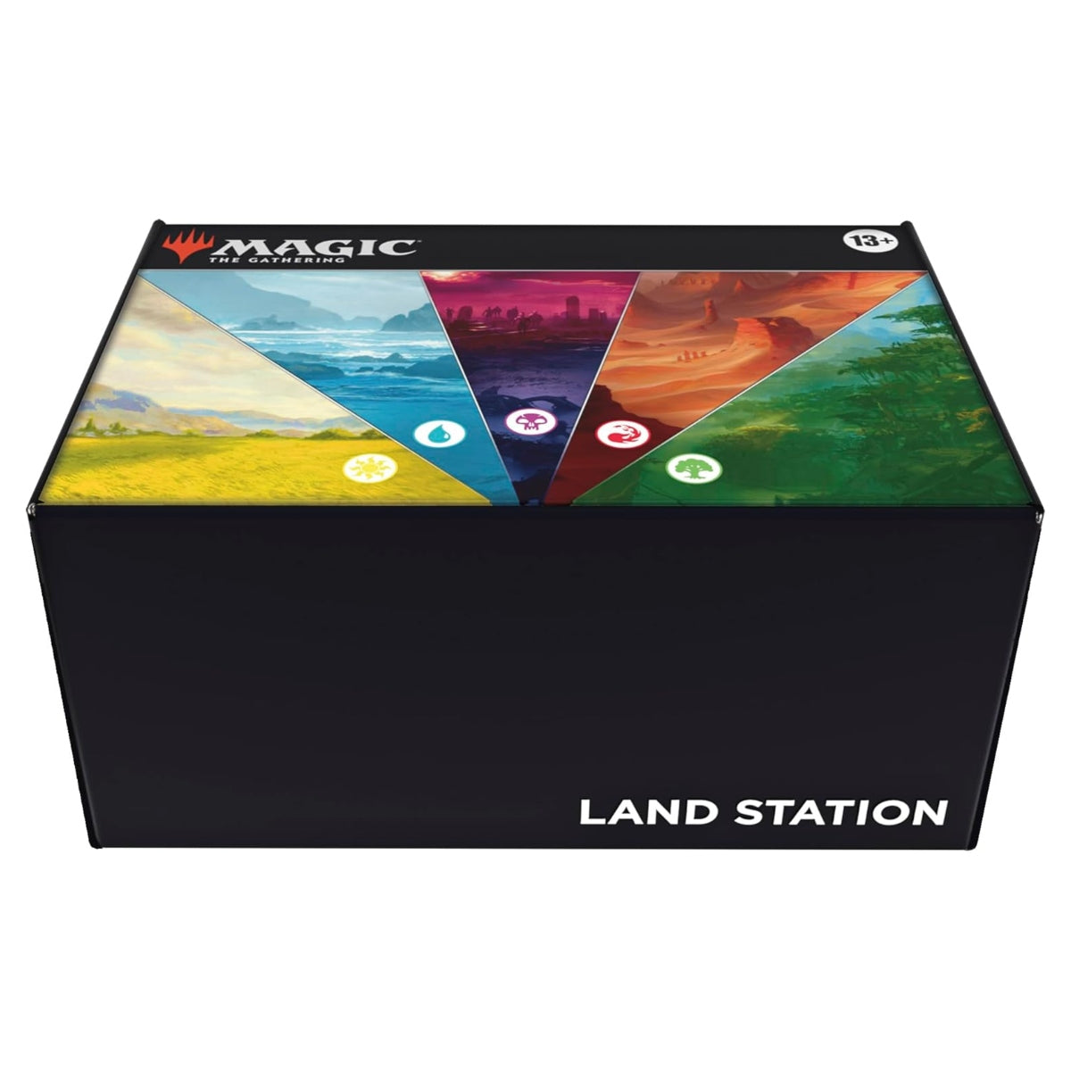 This Land Station contains 400 nonfoil Basic Land cards in a reusable storage box-with 80 Plains (White), 80 Islands (Blue), 80 Swamps (Black), 80 Mountains (Red), and 80 Forests (Green). Each color comes in 3 different card art versions, with all 3 versions included in every box, traveling through the planes of Innistrad, Dominaria, Zendikar, Ixalan, Amonkhet, Theros, Avishkar, and New Phyrexia.