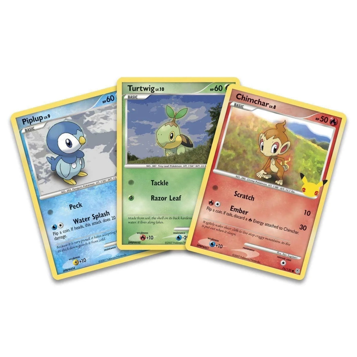 A big celebration - with gigantic Pokemon TCG cards! This First Partner Pack contains a set of 3 awesome oversized cards for your Pokemon TCG collection, featuring the three first partner pokemon of the Sinnoh region - Turtwig, Chimchar, and Piplup!