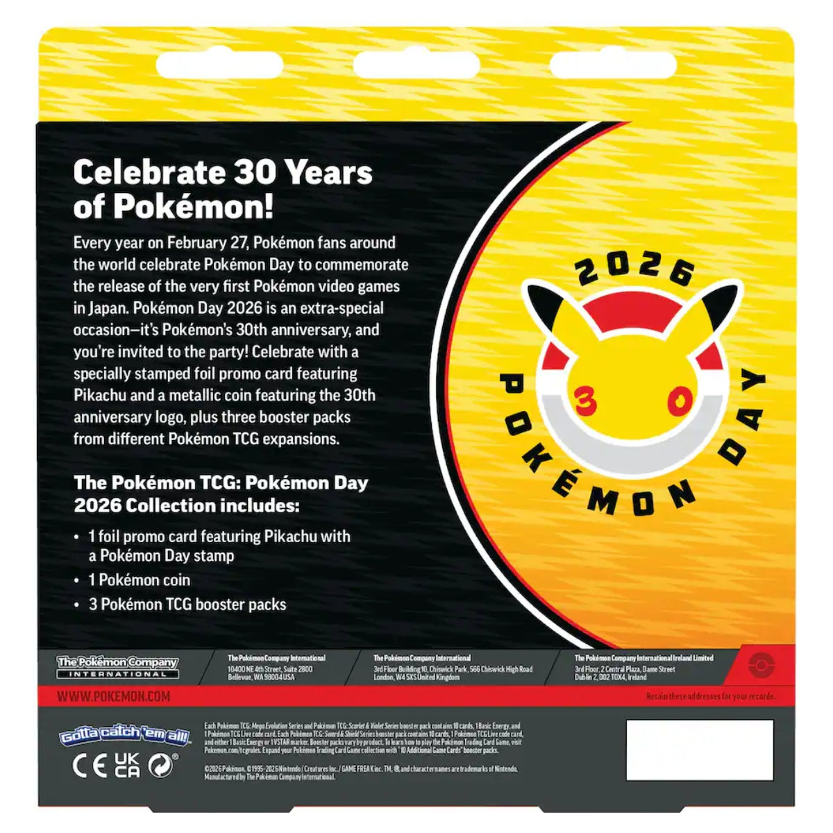 Celebrate 30 Years of Pokémon! Every year on February 27, Pokémon fans around the world celebrate Pokémon Day to commemorate the release of the very first Pokémon video games in Japan. Pokémon Day 2026 is an extra-special occasion-it's Pokémon's 30th anniversary, and you're invited to the party! Celebrate with a specially stamped foil promo card featuring Pikachu and a metallic coin featuring the 30th anniversary logo, plus three booster packs from different Pokémon TCG expansions.