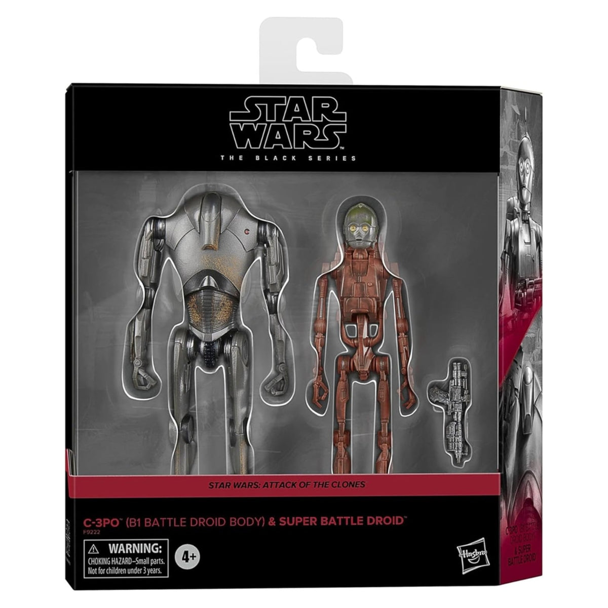 Star Wars The Black Series includes 6 inch action figures, vehicles, and roleplay items from the 40-plus-year legacy of the Star Wars galaxy, letting fans create galactic scenes with a faithfulness to Star Wars comic books, movies, series, and more. When C-3PO loses his head in a Separatist droid factory, it's replaced with a battle droid's - leading to confusion in the colosseum during the Battle of Geonosis. This 2 pack includes a Super Battle Droid that features an updated weathered deco paint.