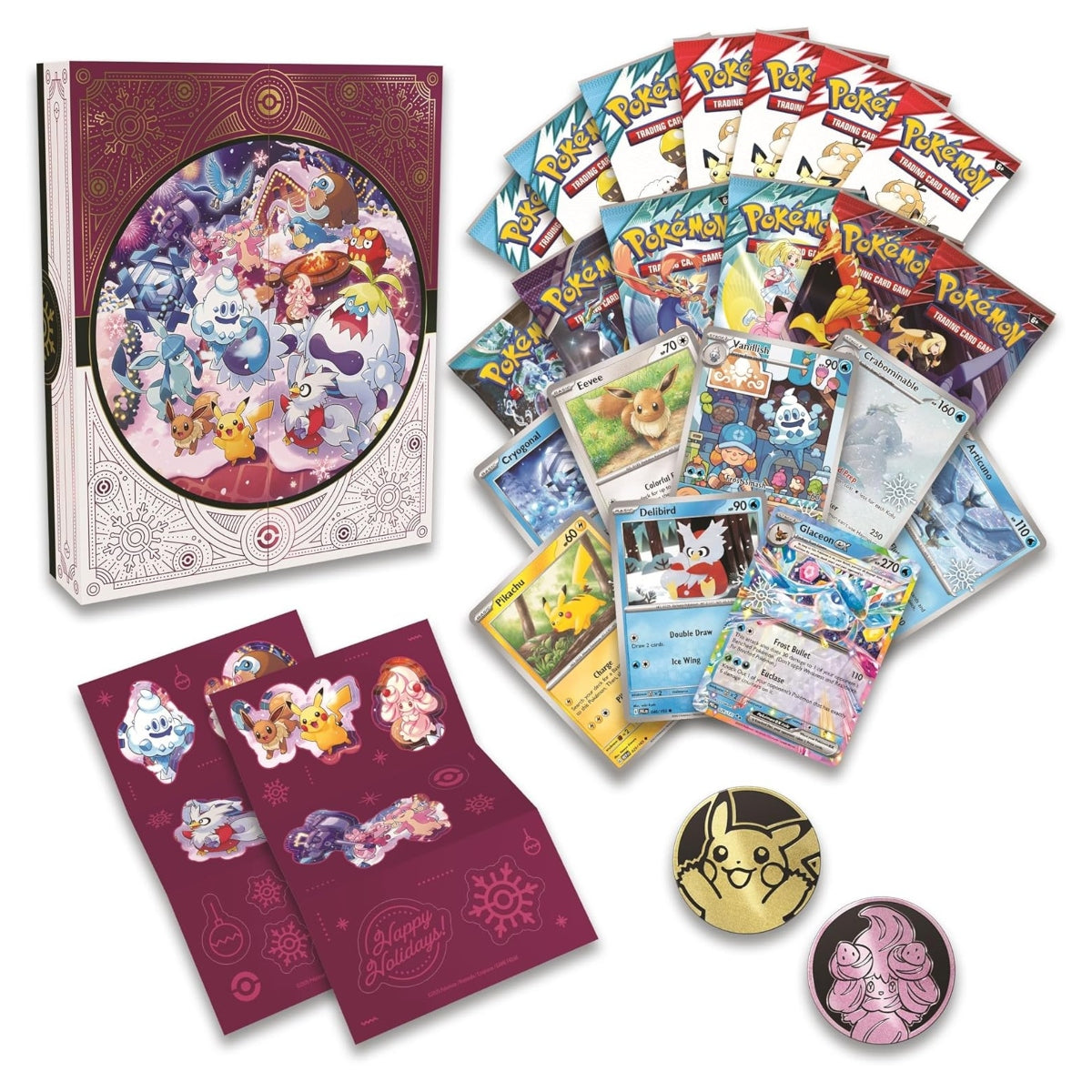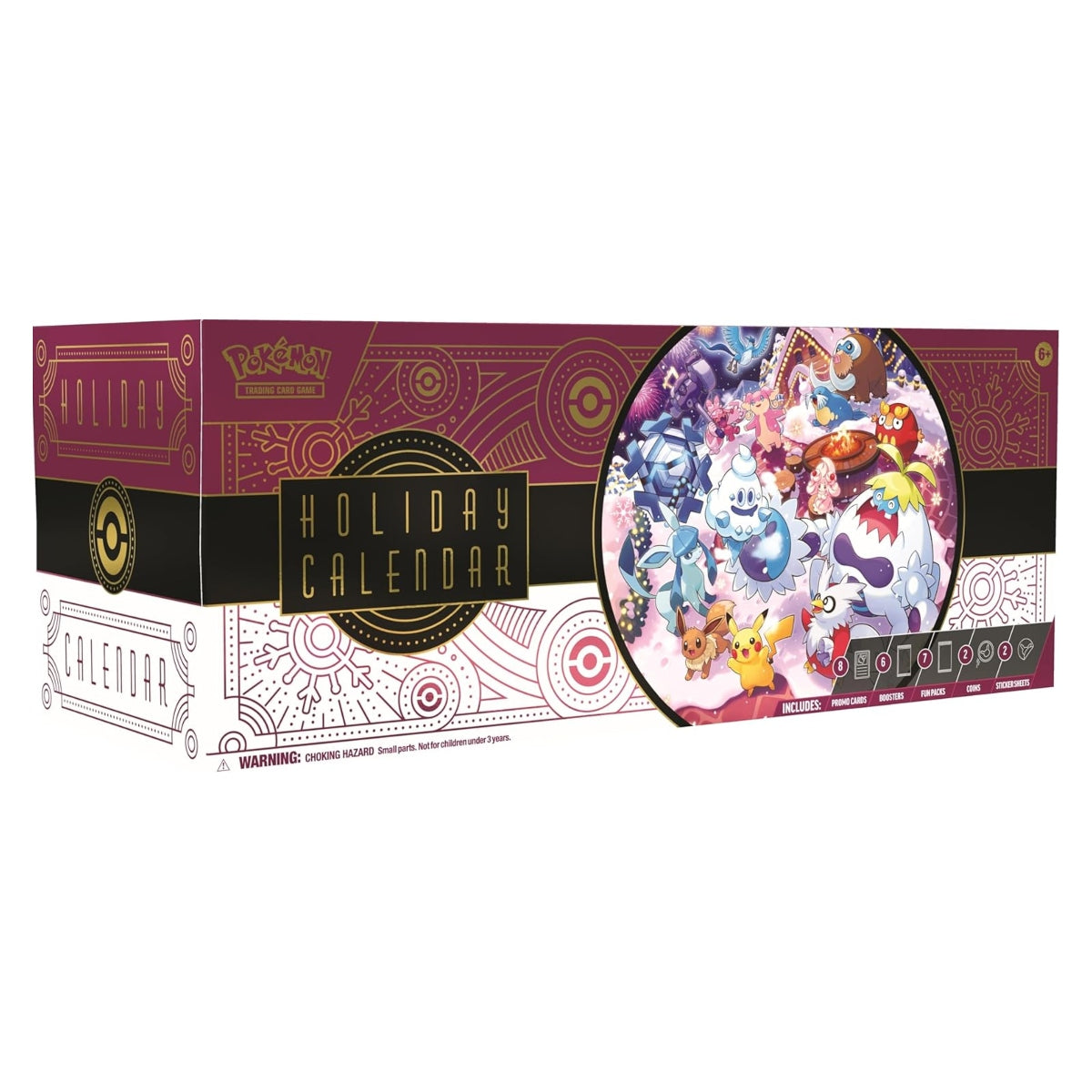 Celebrate the happiest season of them all with 25 days of surprises in the Pokémon Trading Card Game: Holiday Calendar! From special foil cards to booster packs and more, there's a different Pokémon goodie to open every day. Whether you're treating yourself or embracing the season of giving, every day's a delight with this holiday calendar. The Pokémon TCG: Holiday Calendar includes 25 surprises to discover: 8 foil Pokémon TCG cards with a festive stamp, 6 Pokémon TCG booster packs, 7 Pokémon TCG 3-card fun packs, 2 Pokémon coins, 2 Pokémon sticker sheets, and find a code card for Pokémon TCG Live!