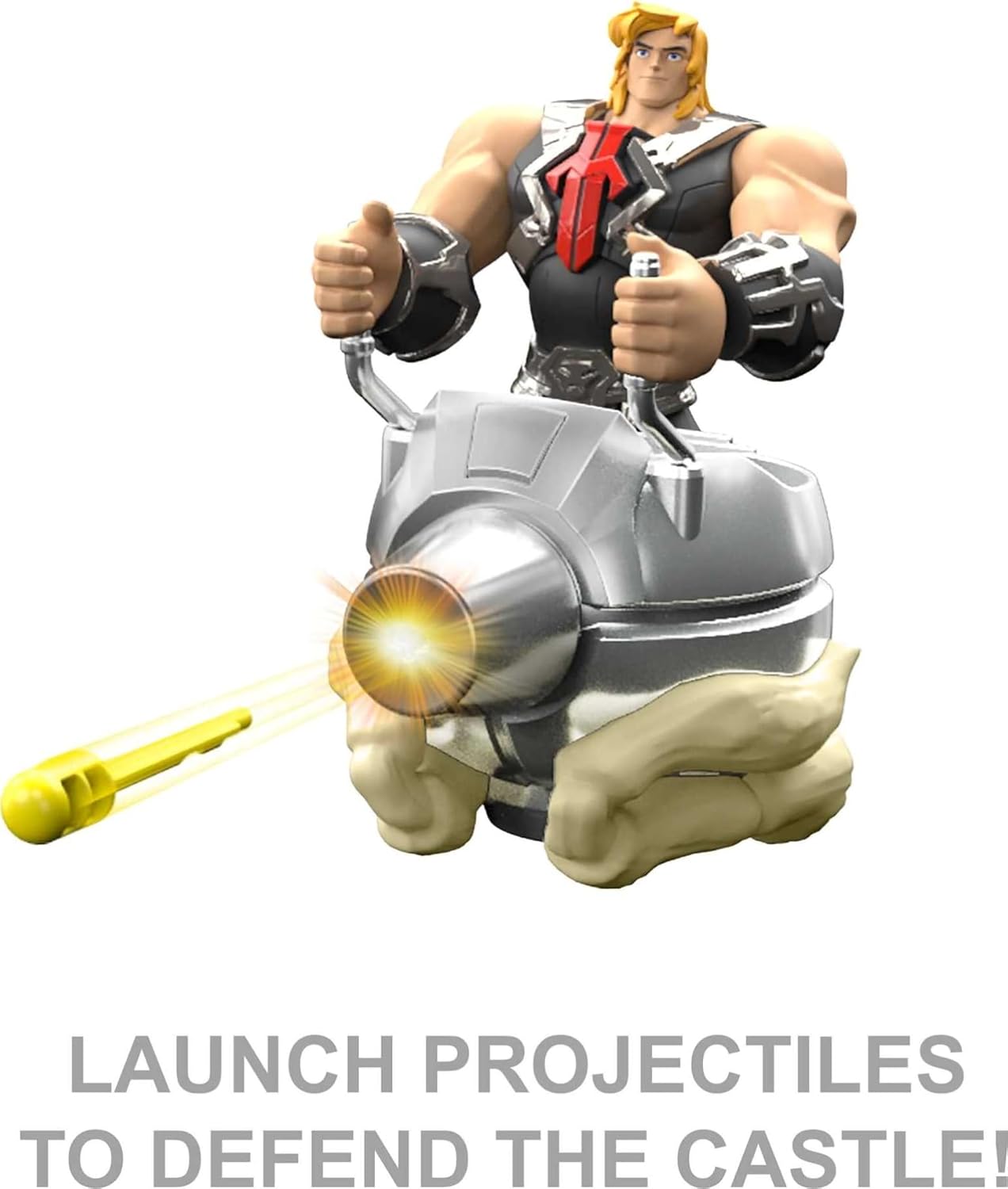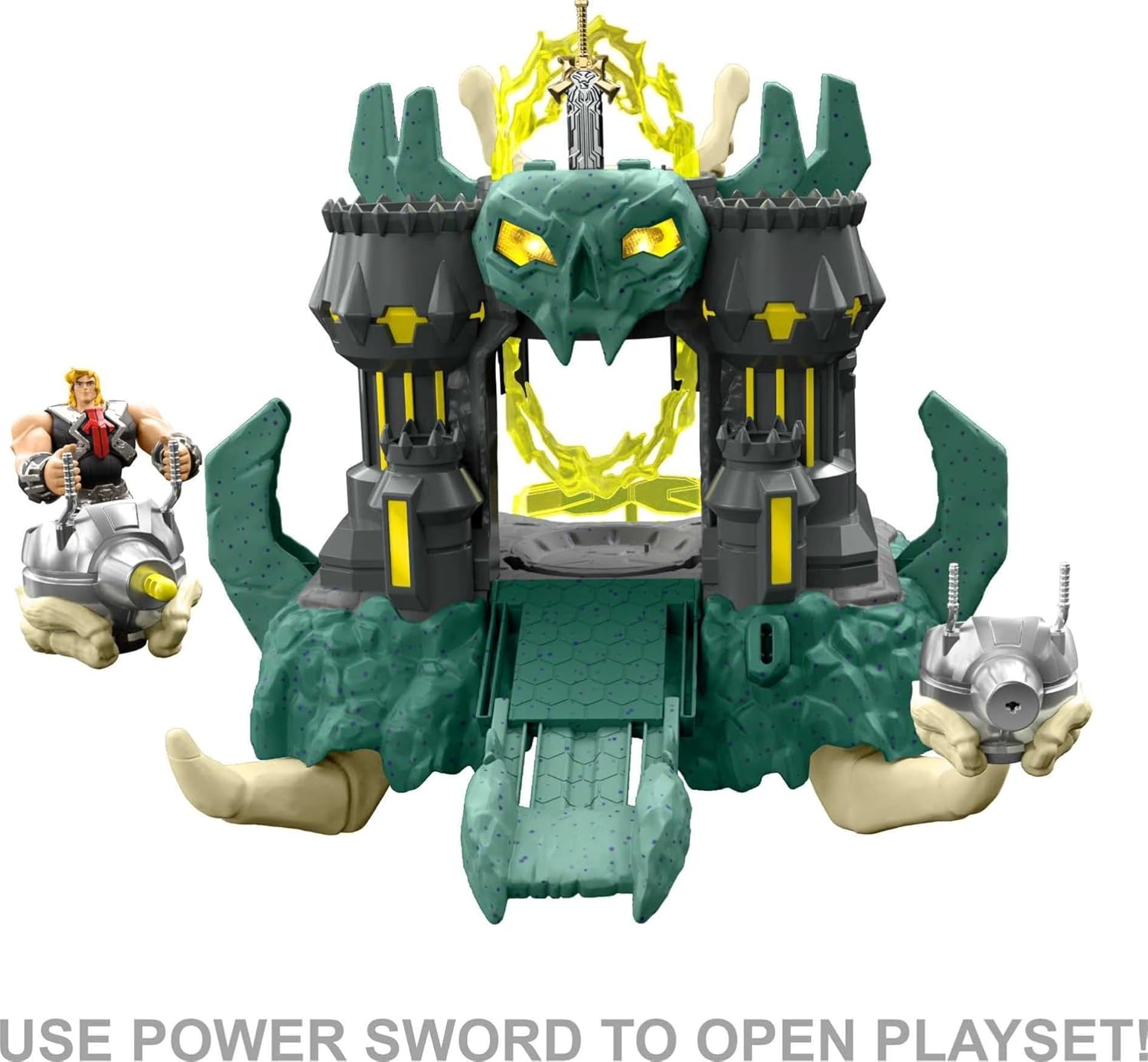 Bring Castle Grayskull Home! Relive all the good vs evil battles of Eternia with this playset of the mighty fortress with extensive features. This toy design stays true to the animated series on Netflix and brings the drama to life with dramatic lights and sounds, a fold-out "Jawbridge," fold-down battle stations, detachable pods with missiles, and battle accessories.