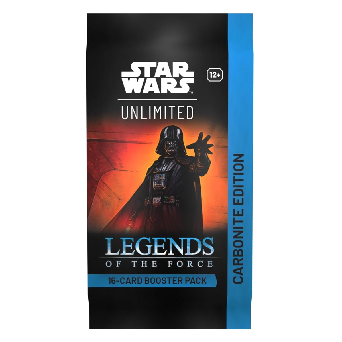 Enhance your Star Wars: Unlimited collection with a special Carbonite booster pack! These special premium packs are loaded with variant cards with special aesthetic treatments, making them the perfect packs for collectors. In this Carbonite booster pack display for the game's fifth set, Legends of the Force, you'll find 12 individually wrapped Carbonite booster packs. Each pack contains approximately: 1 Hyperspace/Showcase leader card, 6 premium foil cards, 1 foil rare or legendary card, 1 Carbonite-exclusive Prestige card, 4 Hyperspace cards, 1 Hyperspace rare or legendary card, and 2 Hyperspace foil cards. The Legends of the Force set features characters and content from multiple eras in the Star Wars galaxy, with a particular focus on Force users, such as Jedi, Sith, and more. Carbonite booster packs are limited in quantity and are designed to enhance the collections of diehard fans. They will not be reprinted.